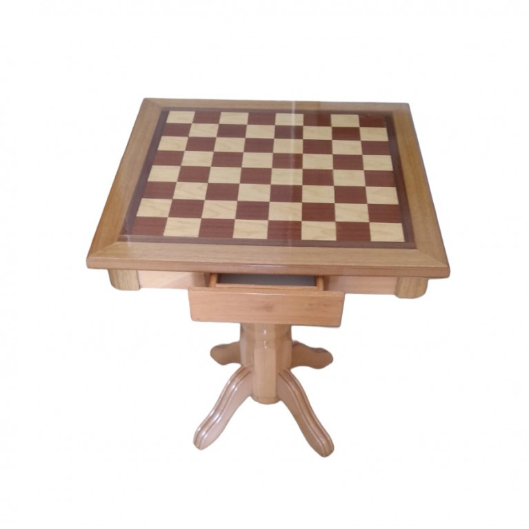 Négyzet alakú, világos színű magas és nagy sakkasztal fiókos sakkfigurák számára. Elegáns bútor. Játékok és találkozók helyszíne. Ez az asztal kétségtelenül díszíti nappaliját vagy teraszát, és nagyszerű ajándék lesz a barátoknak is.