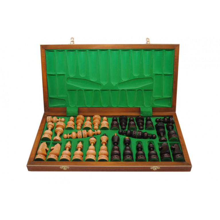 A sakkfigurák cseresznyefából készültek. Fémmel töltve.